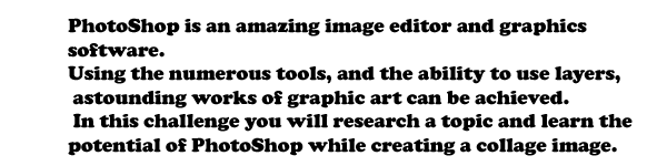 - experiment with the various PhotoShop tools such as the filters and colour enhancements etc. remember Tips and Hints