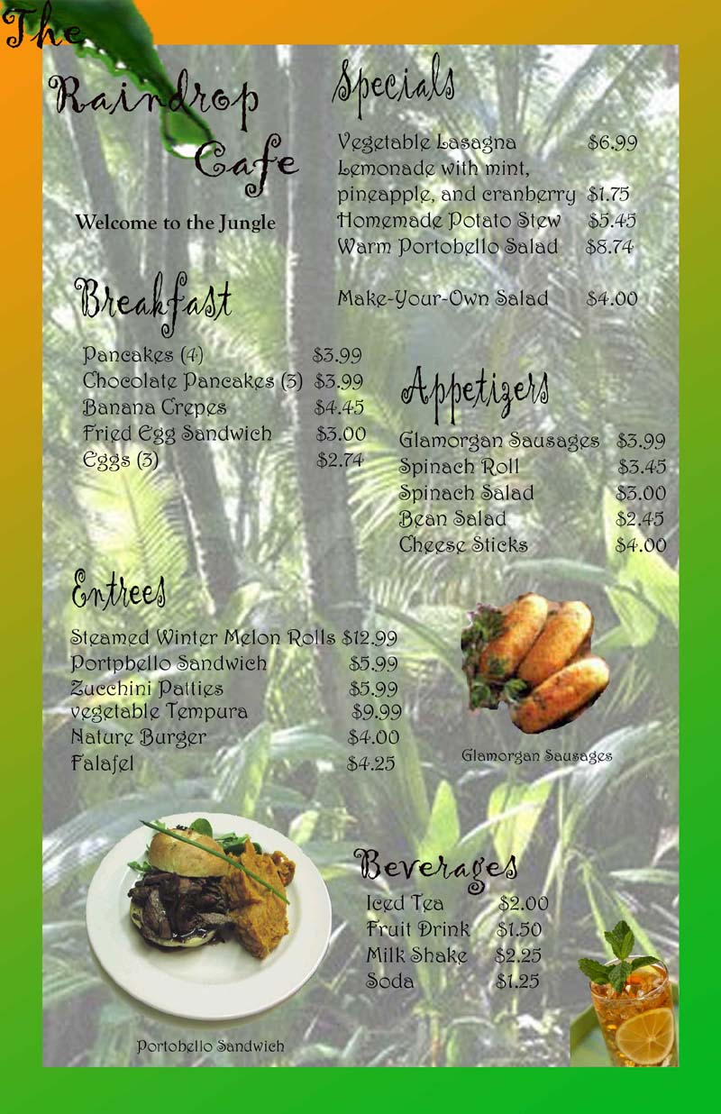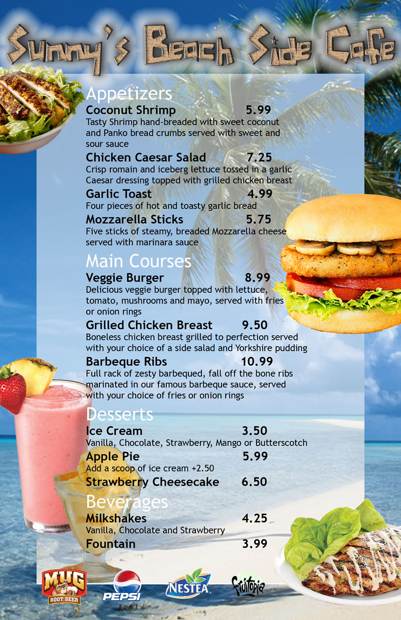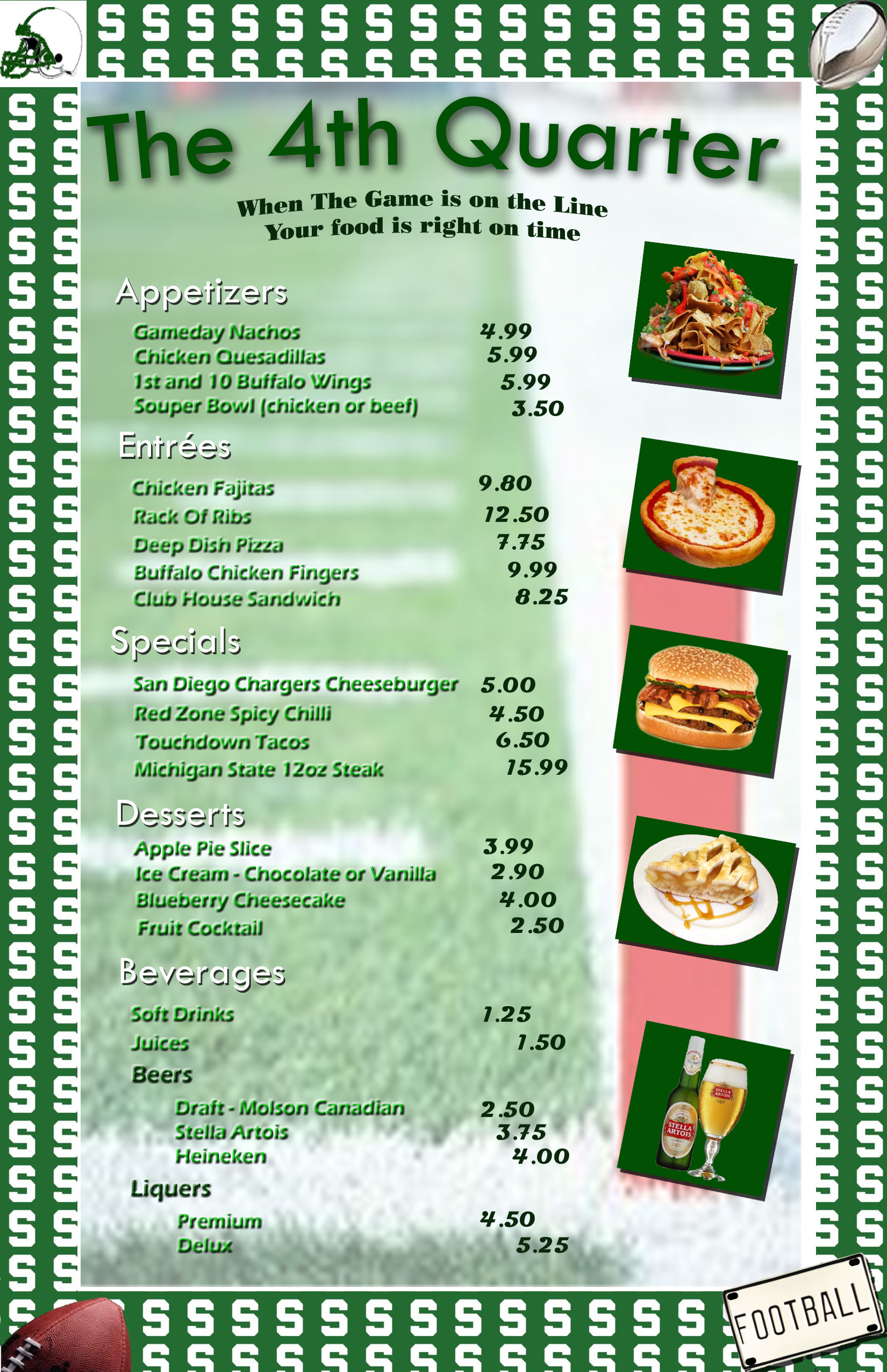 Include a variety of typical food items from your restaurant as well as printed items and typical pricing. In class lessons will give you the skills to produce a professional graphic! Be sure to start right by setting your canvas to the correct dimensions (11 inches X 17 inches) and DPI (150) before starting the layout of your design.