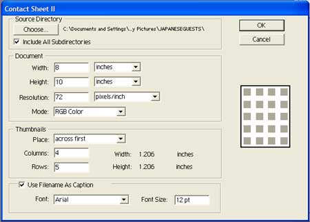 1] Go to ...... File > Automate > Contact Sheet || 2] Choose your images from your image directory 3] Set up your Gallery by # row and # columns 4] Let it rip (OK) 5] It will take some time for your images to compile 6] Print out Save for Web and place in your portfolio