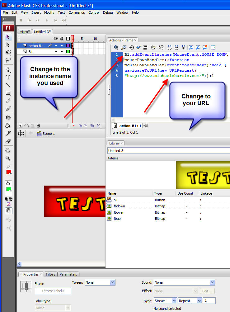 by the paint bucket and you will return from the intertween Window > Actions - copy AND paste the following Action Script 3 code into the Actions Window and change the name of the instance that it controls AND the URL that you want to go to Action Script Code = URLrequest (please edit to your needs) copy/paste b1.addEventListener(MouseEvent.MOUSE_DOWN, mouseDownHandler);