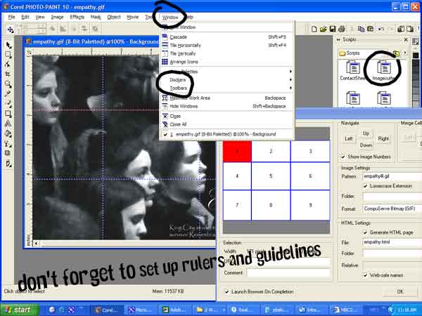 Since production of a great page layout in Corel or PhotoShop and then slicing it is very time consuming you will probably limit this procedure to Splash Pages (index page) large gifs/jpgs, or for clients with good taste AND lots of money! To perform this slicing action you can use PhotoShop which includes a program called Image Ready which will perform the slicing or use PhotoPaint image cutting scripts (windows>dockers>scripts>image cutter). The following tutorial will use Corel PhotoPaint since it is available on our network. Slicing a GIF or JPG..... > open