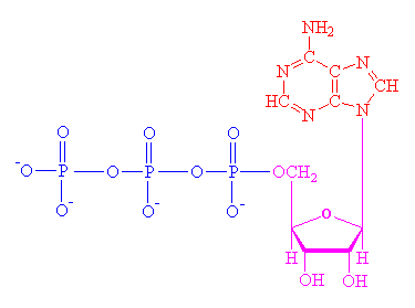 biological molecule, adenosine triphosphate. ATP energeticsATP works by losing the end most phosphate group when instructed to do so by an enzyme. This reaction releases a lot of energy, which the organism can then use to build proteins, contact muscles, etc. The reaction product is adenosine diphosphate (ADP), and the phosphate group either ends up as orthophosphate (HPO4) or attached to another molecule (e.g. an alcohol). Even more energy can be extracted by removing a second phosphate group to produce adenosine monophosphate (AMP). the energy is released HPO4 is produced (when bonds are broken) The reverse reaction takes place