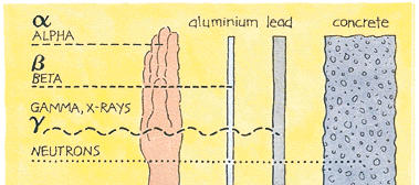 X-rays and gamma rays, like light, represent energy transmitted in a wave without the movement of material, just as heat and light from a fire or the sun travels through space. X-rays and gamma rays are virtually identical except that X-rays are generally produced artificially rather than coming from the atomic nucleus. Unlike light, X-rays and gamma rays have great penetrating power and can pass through the human body. Thick barriers of concrete, lead or water are used as protection from them. Alpha particles consist of two protons and two neutrons, in the form of atomic nuclei. They thus have a positive electrical charge and are emitted from naturally occurring heavy elements such as uranium and radium, as well as from some man-made elements. Because of their relatively large size, alpha particles collide readily with matter and lose their energy quickly. They therefore have little penetrating power and can be stopped by the first layer of skin or a sheet of paper. However, if alpha sources are taken into the body, for example by breathing or swallowing radioactive dust, alpha particles can affect the body's cells. Inside the body, because they give up their energy over a relatively short distance, alpha particles can inflict more severe biological damage than other radiations. Beta particles are fast-moving electrons ejected from the nuclei of atoms. These particles are much smaller than alpha particles and can penetrate up to 1 to 2 centimetres of water or human flesh. Beta particles are emitted from many radioactive elements. They can be stopped by a sheet of aluminium a few millimetres thick. Cosmic radiation consists of very energetic particles including protons which bombard the earth from outer space. It is more intense at higher altitudes than at sea level where the earth's atmosphere is most dense and gives the greatest protection. Neutrons are particles which are also very penetrating. On Earth they mostly come from the splitting, or fissioning, of certain atoms inside a nuclear reactor. Water and concrete are the most commonly used shields against neutron radiation from the core of the nuclear reactor. It is important to understand that alpha, beta, gamma and X-radiation does not cause the body to become radioactive. However, most materials in their natural state (including body tissue) contain measurable amounts of radioactivity. MEASURING IONISING RADIATION Grays and Sieverts The human senses cannot detect radiation or discern whether a material is radioactive. However, a variety of instruments can detect and measure radiation reliably and accurately. The amount of ionising radiation, or 'dose', received by a person is measured in terms of the energy absorbed in the body tissue, and is expressed in gray. One gray (Gy) is one joule deposited per kilogram of mass. Equal exposure to different types of radiation expressed as gray do not however necessarily produce equal biological effects. One gray of alpha radiation, for example, will have a greater effect than one gray of beta radiation. When we talk about radiation effects, we therefore express the radiation as effective dose, in a unit called the sievert (Sv). Regardless of the type of radiation, one sievert (Sv) of radiation produces the same biological effect. Smaller quantities are expressed in 'millisievert' (one thousandth) or 'microsievert' (one millionth) of a sievert. We will use the most common unit, millisievert (mSv), here. WHAT ARE THE HEALTH RISKS FROM IONISING RADIATION? It has been known for many years that large doses of ionising radiation, very much larger than background levels, can cause a measurable increase in cancers and leukemias ('cancer of the blood') after some years delay. It must also be assumed, because of experiments on plants and animals, that ionising radiation can also cause genetic mutations that affect future generations, although there has been no evidence of radiation-induced mutation in humans. At very high levels, radiation can cause sickness and death within weeks of exposure - see Table. The degree of damage caused by radiation depends on many factors dose, dose rate, type of radiation, the part of the body exposed, age and health, for example. Embryos including the human fetus are particularly sensitive to radiation damage. But what are the chances of developing cancer from low doses of radiation? The prevailing assumption is that any dose of radiation, no matter how small, involves a possibility of risk to human health. However there is no scientific evidence of risk at doses below about 50 millisieverts in a short time or about 100 millisieverts per year. At lower doses and dose rates, up to at least 10 millisieverts per year, the evidence suggests that beneficial effects are as likely as adverse ones.