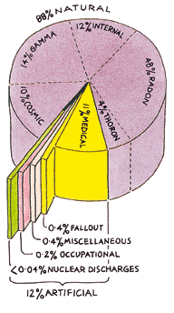 BACKGROUND RADIATION Naturally occurring background radiation is the main source of exposure for most people. Levels typically range from about 1.5 to 3.5 millisievert per year but can be more than 50 mSv/yr. The highest known level of background radiation affecting a substantial population is in Kerala and Madras States in India where some 140,000 people receive doses which average over 15 millisievert per year from gamma radiation in addition to a similar dose from radon. Comparable levels occur in Brazil and Sudan, with average exposures up to about 40 mSv/yr to many people. Several places are known in Iran, India and Europe where natural background radiation gives an annual dose of more than 50 mSv and up to 260 mSv (at Ramsar in Iran). Lifetime doses from natural radiation range up to several thousand millisievert. However, there is no evidence of increased cancers or other health problems arising from these high natural levels. MAN-MADE RADIATION Ionising radiation is also generated in a range of medical, commercial and industrial activities. The most familiar and, in national terms, the largest of these sources of exposure is medical X-rays. A typical breakdown between natural background and artificial sources of radiation is shown in the pie chart. Natural radiation contributes about 88% of the annual dose to the population and medical procedures most of the remaining 12%. Natural and artificial radiations are not different in kind or effect. PROTECTION FROM RADIATION Because exposure to high levels of ionising radiation carries a risk, should we attempt to avoid it entirely? Even if we wanted to, this would be impossible. Radiation has always been present in the environment and in our bodies. However, we can and should minimise unnecessary exposure to significant levels of man-made radiation. Radiation is very easily detected. There is a range of simple, sensitive instruments capable of detecting minute amounts of radiation from natural and man-made sources. There are four ways in which people are protected from identified radiation sources: Limiting time: For people who are exposed to radiation in addition to natural background radiation through their work, the dose is reduced and the risk of illness essentially eliminated by limiting exposure time. Distance: In the same way that heat from a fire is less the further away you are, the intensity of radiation decreases with distance from its source. Shielding: Barriers of lead, concrete or water give good protection from penetrating radiation such as gamma rays. Radioactive materials are therefore often stored or handled under water, or by remote control in rooms constructed of thick concrete or lined with lead. Containment: Radioactive materials are confined and kept out of the environment. Radioactive isotopes for medical use, for example, are dispensed in closed handling facilities, while nuclear reactors operate within closed systems with multiple barriers which keep the radioactive materials contained. Rooms have a reduced air pressure so that any leaks occur into the room and not out from the room. STANDARDS AND REGULATION Radiation protection standards are based on the conservative assumption that the risk is directly proportional to the dose, even at the lowest levels, though there is no evidence of risk at low levels. This assumption, called the 'linear no-threshold (LNT) hypothesis', is recommended for radiation protection purposes only such as setting allowable levels of radiation exposure of individuals. It cannot properly be used for predicting the consequences of an actual exposure to low levels of radiation. For example, it suggests that, if the dose is halved from a high level where effects have been observed, there will be half the effect, and so on. This could be very misleading if applied to a large group of people exposed to trivial levels of radiation and could lead to inappropriate actions to avert the doses. Much of the evidence which has led to today's standards derives from the atomic bomb survivors in 1945, who were exposed to high doses incurred in a very short time. In setting occupational risk estimates, some allowance has been made for the body's ability to repair damage from small exposures, but for low-level radiation exposure the degree of protection may be unduly conservative. Most countries have their own systems of radiological protection which are often based on the recommendations of the International Commission on Radiological Protection (ICRP). The 'authority' of the ICRP comes from the scientific standing of its members and the merit of its recommendations. The three key points of the ICRP's recommendations are: