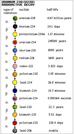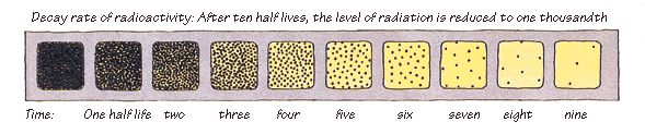 Atoms in a radioactive substance decay in a random fashion but at a characteristic rate. The length of time this takes, the number of steps required and the kinds of radiation released at each step are well known. The half-life is the time taken for half of the atoms of a radioactive substance to decay. Half-lives can range from less than a millionth of a second to millions of years depending on the element concerned. After one half-life the level of radioactivity of a substance is halved, after two half-lives it is reduced to one quarter, after three half-lives to one-eighth and so on. All uranium atoms are mildly radioactive. The following figure for uranium-238 shows the series of different radioisotopes it becomes as it decays, the type of radiation given off at each step and the 'half-life' of each step on the way to stable, non-radioactive lead-206. The shorter-lived each kind of radioisotope, the more radiation it emits per unit mass. Much of the natural radioactivity in rocks and soil comes from this decay chain.