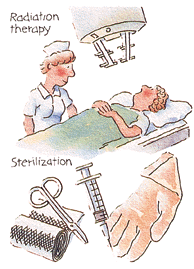 Higher accumulated doses of radiation might produce a cancer which would only be observed several - up to twenty - years after the radiation exposure. This delay makes it impossible to say with any certainty which of many possible agents were the cause of a particular cancer. In western countries, about a quarter of people die from cancers, with smoking, dietary factors, genetic factors and strong sunlight being among the main causes. Radiation is a weak carcinogen, but undue exposure could certainly increase health risks. The body has defence mechanisms against damage induced by radiation as well as by chemical and other carcinogens. These can be stimulated by low levels of exposure, or overwhelmed by very high levels. On the other hand, large doses of radiation directed specifically at a tumour are used in radiation therapy to kill cancerous cells, and thereby often save lives (usually in conjunction with chemotherapy or surgery). Much larger doses are used to kill harmful bacteria in food, and to sterilise bandages and other medical equipment. Radiation has become a valuable tool in our modern world. See also The Peaceful Atom in this series. Tens of thousands of people in each technically advanced country work in medical and industrial environments where they may be exposed to radiation above background levels. Accordingly they wear monitoring 'badges' while at work, and their exposure is carefully monitored. The health records of these occupationally exposed groups often show that they have lower rates of mortality from cancer and other causes than the general public and, in some cases, significantly lower rates than other workers who do similar work without being exposed to radiation.