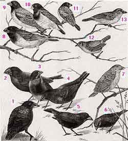 ![]() 1. Large cactus finch (Geospiza conirostris) 2. Large ground finch (G. magnirostris) 3. Medium ground finch (Geospiza fortis) 4. Cactus finch (G. scandens) 5. Sharp-beaked ground finch (G. difficilis) 6. Small ground finch (G. fuliginosa) 7. Woodpecker finch (Cactospiza pallida) 8. Vegetarian tree finch (Platyspiza crassirostris) 9. Medium tree finch (Camarhynchus pauper) 10. Large tree finch (Camarhynchus psittacula) 11. Small tree finch (C. parvulus) 12. Warbler finch (Certhidia olivacea) 13. Mangrove finch (Cactospiza heliobates) (From BSCS, Biological Science: Molecules to Man, Houghton Mifflin Co., 1963) |