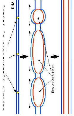 multi step process. This performed in the S phase of the cell cycle. Replication in eukaryotes occurs at numerous points along the Chromosome at replication "bubbles". The partial strands link up to form the full strand in time. 1) A portion of the double helix is unwound by a