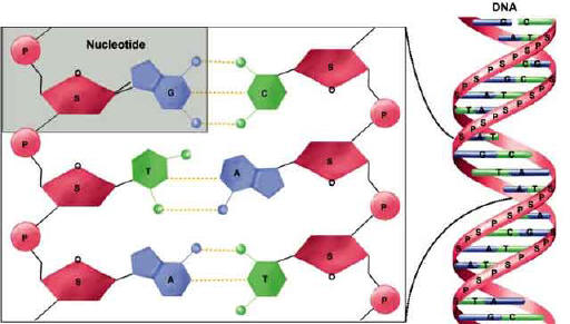 structure of DNA The overall structure of DNA is a double helix made of 4 types of nitrogenous base pairs called nucleotides. The nucleotides are of 2 types purines and pyrimidines. A purine on one side of the helix is hydrogen bonded to a pyrimidine on the other side of the helix. Adenosine and Guanine are purines Cytosine and Thymine are pyrimidines Thus A=T and C=G are