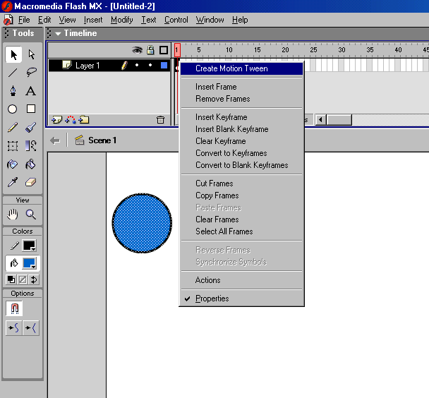 Next, click on the First Frame of Layer 1 and select the "Actions - Frame" box near the bottom. Navigate to "Actions, Movie Control and then double click on stop".