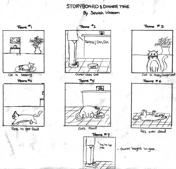 of any multimedia piece. It should act as a guide to help you show what the contents of scenes the sequence the animation / film will take and the line of sight the scene will be viewed by the viewer. A good storyboard helps to guide the production of your movie/animation and helps to organize the production crew in the many steps involved in the preproduction production and post production stages of your creative work. The