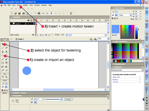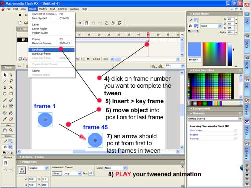 Open Flash Create or import an object in a layer that you want to to the stage Use the select tool to select the object (this must be done or the tween won't work!!!) Insert> create motion tween |