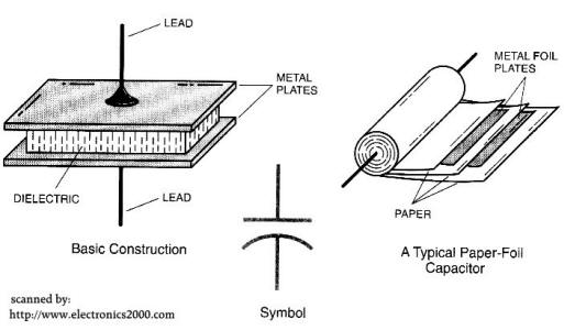 air, paper, oil, tantalum, electrolyte, or other material depending on the