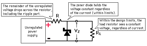 Zener diodes - use predictable reverse breakdown voltages to regulate power supplies at the output ...... loads connected in parallel with the Zener have their voltage supply "clamped" at no higher than the reverse voltage of the Zener diode.