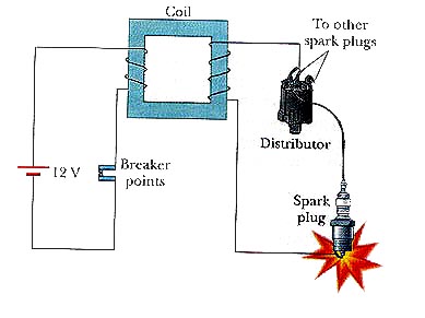 The ignition coil in an ICE is a step up transformer The primary is energized and deenrgized when or When Hall effect transistors switch on / off the coil and generate high voltage for sparking the fuel at the spark plugs |