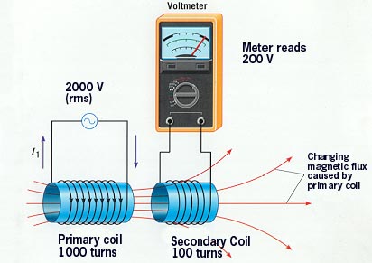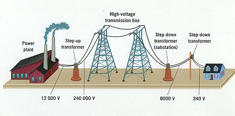 Transformers change AC voltages. They change voltage by stepping up the primary voltage on the secondary side or stepping down the voltage. They are also used to match impedance and as isolating devices that isolate the ground. A.C. is required to operate transformers because the voltage induction that occurs between the primary and secondary requires a rapidly expanding and collapsing electromagnetic field that only alternating current provides. Electrical power transmitted as high voltage has a reduced current. Smaller cable sizes can be used. The cost effectiveness of smaller cables is the reason for high voltage distribution but it must be stepped back down for consumer safety. |