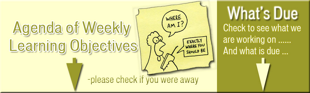September 27 2010 - it is essential that you check the class directories NOW and see if your name is hyperlinked to your index page URL ---- if not please send it to harrismailbox@gmail.com - read over this short self-study lesson on Web Design principles - check to see what is DUe for marking NOW > > > > > >>>>> September 20 2010 -> this week has 4 days PA Day this Friday - lab fee = $30 also --- get a flash drive - VERY IMPORTANT TO GET YOUR index.htm URL SENT TO harrismailbox@gmail.com ------ include your name as seen on list - I have recieved most of the web addresses but need the last ones to complete the class directory TECH Report